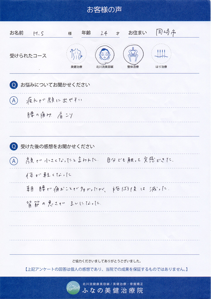お名前 / 年齢 / お住まい H.S様 / 24歳 / 岡崎市 受けられたコース 美健治療 北川流美容鍼 整体治療 はり治療 お悩みについてお聞かせください 疲れが顔に出やすい腰の痛み、肩こり 受けた後の感想をお聞かせください 顔が小さくなったと言われた。自分でも触って実感出来た。体が軽くなった。朝、腰が痛む事が多かったが、施術後は減った。背筋の悪さがましになった。 担当者からのメッセージ ご来院ありがとうございました。小顔になったのを...