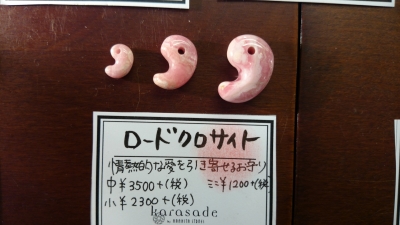 JUGEMテーマ:パワーストーンJUGEMテーマ:開運・幸運についてJUGEMテーマ:ラッキーアイテムJUGEMテーマ:オリジナルアクセこんにちは。佐藤です本日は、キレイなコチラを紹介していきたいと思いますまずは、コレ出雲型勾玉・4月の誕生石でもあるロードクロサイト豊かな人生へ導くお守りといわれていますね今回、入荷したものはキレイなピンク色・ミニ ¥1200・小 ¥2300・中 ¥3500 各+(税)つづきまして・・・・ローズクォーツ (マダガスカル)¥5000・アメジスト(ブラジル) ¥24000・レモ...