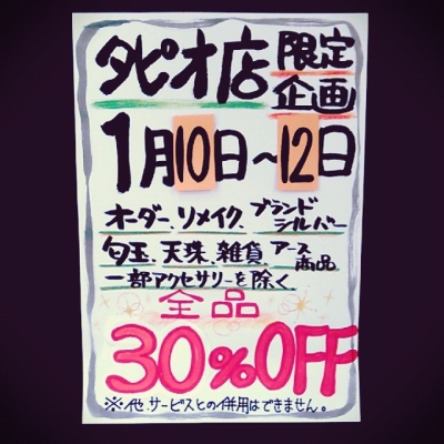 JUGEMテーマ:パワーストーンJUGEMテーマ:鉱石鉱物JUGEMテーマ:開運・幸運について 皆さま、こんにちは世の中バーゲンですねタピオ館内もバーゲンですがお店もバーゲンやってますよ〜昨日のブログでもご案内しましたが5日間だけのお買い得各店の店長が仕入れた商品がびっくりプライスでお待ちしてます更に明日からはコチラも例えばコチラ1月の誕生石ブレス向かって左側は女性向けサイズ ¥8460+税→30%OFFで ¥5922+税向かって右側は男性向けサイズ ¥4570+税→30%OFFで ¥3199+税更にコチラも 向かって...