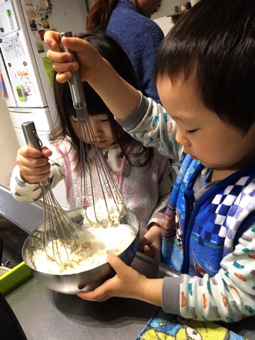 案の定今朝は超〜早起きで朝から大騒ぎだった3歳児2人!! 朝ごはんにパンケーキでも用意しようとすると、2人して 「お手伝いする〜!!」 とわざわざ踏み台持って来て混ぜ混ぜ。 ただし一瞬で終わりましたがw まだ全然混ぜれてないのに「おっけー!」って言ってどっか行った〜^^; お正月ぶりに会ったので大喜びの2人。 ず〜っとくっついて行動してました^^ ハミガキも…絵本読むのもずっと一緒wこうしてみてると双子ちゃんみたい^^(顔もちょっと似てるんですよねw) さてさて。 そんなこんなで朝の準...