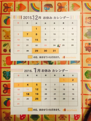 ちょっと引くくらいの裏声(高音)で、テイラースイフトを熱唱する声が 子供部屋から聞こえてきた。 しかもノリノリ♪ 見てないけど、ありゃ踊ってるな。 高1男子・・・怖いって(泣) 今日は、少々早めのお知らせを致します♪ 年末年始は↓↓↓の通り、 なんてったって おもちゃ屋さん!! クリスマスの週は、休まずに営業いたします♡ たっっっくさんの方のご来店を、楽しみにお待ちしております☆ メールでのお問合せはコチラからお願いします。 ↑tocotowa...
