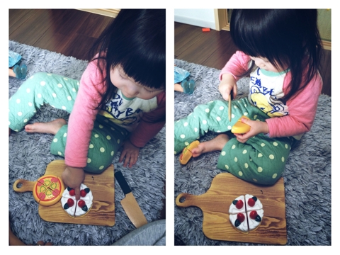 最近お出かけした翌日は引きこもることが多いですね…w 反動かな? なーんか疲れちゃって。…年かな。 こちゃるさんは昨日トイザらスで買ってあげたおままごとのピザとケーキを気に入って延々切ったりつなげたりしてました^^ それしてもやっぱプラスチックの食材は安いですね〜。 基本的には木製のやつのが好きだけど、やっぱおままごとするなら種類もたくさんあった方が楽しめると思うので、こういう木製のやつになさそうなのはプラスチック製で揃えて行ってもいいかなーと思ってます。 ていうかあんま深く考え...