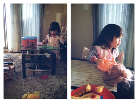 昨日から引き続き頭痛と…どうも風邪引きかけているらしく喉が痛い私です; うーん、色々しんどい。 ここしばらくあれこれ忙しくやってたからその反動でしょうか…。 私が風邪引くのって結構珍しいんだけどなあ。 そんなわけで今日もこちゃるさんには申し訳ないけど引きこもりな一日でした。 あ、でも昨日反省して寝たおかげか今日はイライラすることもなくそれなりに心穏やかに過ごせました^^; こちゃるさんは今日も延々おままごとです。 …あれ?キッチンは?^^; 私がダイニングテーブルに...