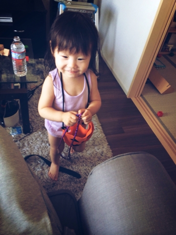 昨日はUSJではしゃぎすぎたため私もめいやんも今朝はぐったり… 特に私は起きたらもう肩も腰も体中が痛くて痛くて…!!!…筋肉痛?(笑) そんな中1人元気いっぱいなこの人。 (寒くないのか?) 昨日のジャックオランタンポーチとパレードでゲットしたネックレス、どっちも気に入って今日ずーっと持って遊んでました。 しかし今日は本当はお友達のYちゃんとハロウィンパーティする予定だったんですが、Yちゃんが昨日から体調が悪くなってしまって; 感染性の病気かも?ということで本日は急遽中止に...