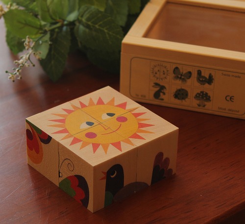 夏に野球部を引退してから、息子の体重は右肩上がり。 先日 急に、ダイエットする!!って意気込みだし、 夜な夜な近所をジョギングして、 ゼェゼェ言いながら帰ってきて、 CCレモンをがぶ飲み&とんがりコーン1箱 たいらげてた。 なんだそりゃ?! お年頃の思考回路は複雑・・or アホなだけか(笑) さてさて、今日は木の立体パズルをご紹介します。 スイスにある家族経営の小さな工房で作られる。 想像するだけで、とっても素敵♪ 6面体なので、6パターンが楽しめる。 独特な絵柄が印象的で、...
