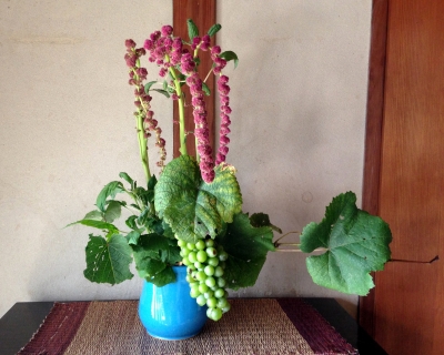 JUGEMテーマ:暮らしの中で お家元の作品を見て 私もブドウをいけてみたいと思いました 蔓の植物は光を求めて 伸びてゆくとのこと・・・ なるほど・・・・・ 私は わが家を一回りして 収穫した花材は アマランサス 昨年大作を行けた時に使ったアマランサスを植えました。 きれいに咲きました。初採りです ネオマスカット 以前、何時かブドウがいけたいと思って買っていた植木鉢 ついについに機会がなく地面に植えました。 今年は30房位つきました その2種を切り取りました 自然のブドウの葉なので ...