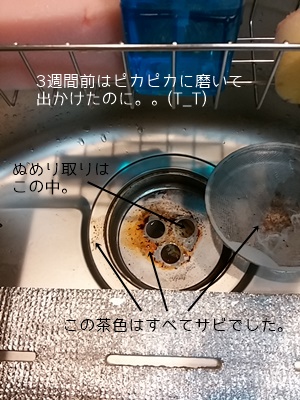 こんにちは、たま子です。 3週間あまり 家を空けていました。 今朝 キッチンのシンクを見て どきっ。。。。 な、、な、、なんか、いる。 排水口のふたに なんか茶色いものが、 なんか小さいものが、いる。 メガネないから よく見えない。 でもメガネかけたくない。 しっかり見たら 怖いかも。 甚平さーーーん! きてーーー! (´゚д゚`) 甚平さんが こわごわ、オープン。 ごみ受けも その下の排水口も サビ!!! サビ!!! サビー!!! はぁ〜。 それはそれでビックリ...