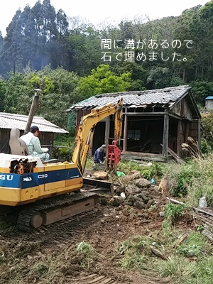 こんにちは、たま子です。 引き続き<古家解体>です。 今朝は10時ごろ現場についてみると おじい、おばあは もう2時間も前から作業中だったとか。 しまった。 年寄りの早起きを忘れていた。 さて 計画では敷地整備や 安全確保など1週間くらいは 準備期間のつもりだったのですが。 おじい達は 「さぁ、壊すどーーー!」 と大張り切り。 すでに1棟目の離れは 中身が空っぽになってます。 さっそく主要な柱に ワイヤーを結んで パワーショベルで引っ張ります。 さー、緊張の一瞬! バリバリッ...