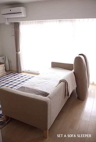 私か主人のどちらかが風邪をひいたら(主に私) 相手にうつさないよう一人はリビングで寝ます。 その時 いつものソファがこの形に。↑ 背もたれのクッションを外すと ちょうどダブルベッド半分の幅になるので 一人で寝るにはちょうどいいサイズ。 そしてソファの足元にある引き出しを引っ張り出して 二つ折りになっている座面クッションを広げると ちゃんとしたダブルベッドにもなります。 これは週末みんなでテレビ見ながら寝たいね〜 なんていうとき...