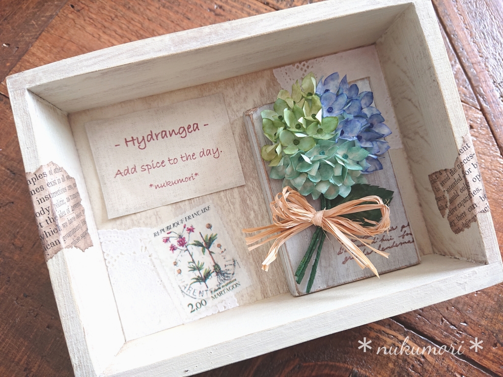 JUGEMテーマ:可愛い雑貨・インテリア こんにちは。 『もみじの木と雑貨屋さん yoo』さんに納品した 作品のご紹介 その3です。 『あじさいのメッセージフレーム』 ペーパークラフトの作品です。 「日常に彩りを」というメッセージを 英語で添えました。 花びら一枚一枚着色しています。 ぼやかした感じで ドライフラ...