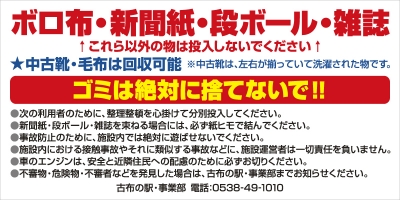 JUGEMテーマ:リサイクル 古布の駅は、皆様のご家庭などで不用となった品物を回収し、用途によってはまだまだ利用可能な品物については再利用へと橋渡しするための施設です。 したがって、ゴミを回収する施設ではありません。ルールやマナーを守っていただきながら、皆様の生活の中で有効利用していただければと思います。
