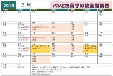 レッスン予約について。 ■■■■■■■■■■■■■■■■■■■■■■■■■ 7月の営業カレンダー ピンクの枠の開講時間に予約可能です。 以下のような赤〇は1名予約有りで追加1名可能です。 ○11時 ミルクスティック 赤●文字はご予約済みで追加不可です。 (●11時 2名で追加不可) キャンセル待ちとなります。 単発のお菓子レッスンも承ります。 やはりピンクの枠からお選びください。 カレンダーの画像が大きく表示されない方のための 文字でのご...