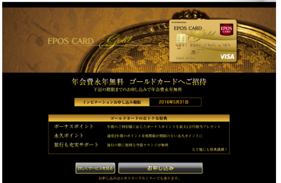 JUGEMテーマ:クレジットカード サブカードとして作成したEPOSカードですが、ゴールドカードのインビテーションがきました。メールで。 エポスゴールドカードは、普通に入会すると年会費が5000円かかりますが、インビテーションが来た場合は年会費無料で持てます。 通常入会でも、年間50万使用すれば次年度からは無料になります。 断る理由は無いので、アップグレードを申し込みました。 私は昨年の9月末に入会し、実質10月から使用を開始しました。 どうやら4/15日の更新でインビテーションが有効になった模様です。 3月...