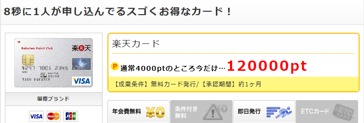 JUGEMテーマ:マイル、マイレージ 楽天カードは、カード利用額の1%が楽天スーパーポイントとして還元されます。 楽天スーパーポイントは、ネット市場最大級の楽天市場をはじめ、楽天ブックス、楽天トラベルなど、楽天グループのサービスで、1ポイント=1円として利用できます。 楽天カードの詳細は、ここからご覧下さい。 ○ポイントサイト【ポイントインカム】からの入会では、初めての入会で、これまでの最高である120、000のポイ ントインカムポイント(12、000円分)がもらえます。 &nb...