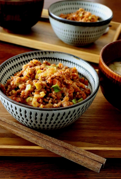 ●今日のごはん● 〈ラー油ネギ豚そぼろ丼♪〉 嬉しいハウス様のモニター・・今回は真っ赤な色が食欲そそる”辣油”。 豚ひき肉とネギを炒め、コチュジャンにオイスターソース、鷹の爪・・ちょっと中華風♪ わしわし食べる休日ランチ。 ハウス・辣油♪ 純正ごま油100%使用、唐がらしの辛味ブレンド。 辣油ネギ豚そぼろ丼(2人分) 炊きたてごはん2杯(およそ300g) 豚ひき肉120g ネギ100g ごま油大さじ2分の1 サラダ...