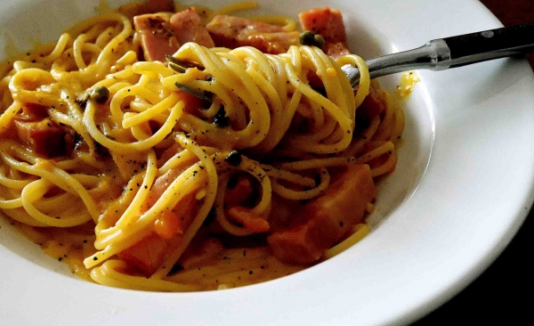 ●パン工房● 〈ずぼらなおひとり様ランチ&猫様♪〉 昨夜の残りもの、失敗ソフトフランス用のかぼちゃのディップ・・生クリームで伸ばしてるので好都合♪ 袋から出したまんまの不揃いベーコンを、たっぷりのオリーブオイルで炒め、 (もうちょっと焼き色ほしい所!) 茹でたパスタを入れ、白ワイン、茹で汁、顆粒コンソメひとつまみ、生クリームにかぼちゃのディップ、 ブラックペパーと塩で味を整え・・・ずぼら飯出来上がり♪ (パンチェッタだったら、コンソメなしでオッケー^...