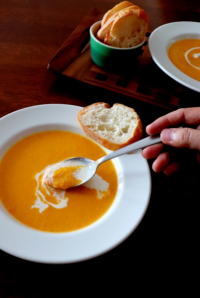 ●パン工房● 〈キャロットスープ&エスカップ男子・・にゃ♪〉 休みを取り午後から健康診断の相棒殿、負担のないようスープとパンの朝ごはんにしました。 隠し味程度のかぼちゃ、そして”藻塩”。 普段は有機ブイヨンのみなんですが、人参が甘いのでね、ひとつまみ(^^ 良い感じ♪ キャロットスープ(たっぷり2人分)♪ 人参180g 玉ねぎ90g かぼちゃ80g 無塩バター15g 水150g 牛乳250g 有機ブイヨン固形1個 藻塩1つまみ 人参、玉ね...