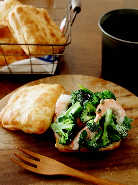 ●パン工房● 〈クリスケットでカンタン朝ごはん・・にゃ♪〉 今回は、嬉しいレシピブログ様のモニターです♪ 手で割って、軽くオーブントースターで温め、好きな具材をこれでもかと乗せて♪ 甘くないデニッシュなので、こんな風にお惣菜パンの代わりにしても良いし(^^ 餡やホイップ悔いリーム乗っけて、菓子パンの代わりにも♪ いろいろ楽しめるクリスケット・・ホースラディッシュを効かせたソースの海老サラダと。 海老サラダのクリスケットサンド(1人分)♪ ク...
