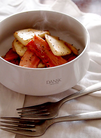 ●パン工房●〈蕪と人参と・・お野菜いっぱい&興味津々にゃ♪〉蕪のあのきめ細かさ、瑞々しさ、姿形、そして火の通りの速さ・・etc。良いこと尽くし、私は蕪が大好き♪お友達の”くちゃちゃとるるっけつ”の”まま”ちゃんから頂いだ贈りものの中にも♪早々と千枚漬けで頂きました・・有難う♪そしてまたも道の駅で手にしておりました(爆)この蕪は、お歳暮で(爆)頂いた立派なんベーコンと♪蕪とベーコンの炒めもの(およそ2人分)♪蕪(大きい物)1個厚切りベーコン8枚オリーブオイル大さじ2塩少々黒胡椒適量乾燥オレガノ適量。蕪は綺麗に洗...
