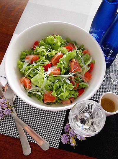 ●今日の1品●〈澪で楽しむパーティーレシピ・・炙りサーモンのご馳走サラダ&にゃ♪〉楽しいモニター・・続きます♪この間に冷凍庫を占領しているパンの消費〜〜(^^一石二鳥♪塩麹漬け炙りサーモンのご馳走サラダ♪(およそ4人分)トロピグリンレタス130gプチトマト110g生サーモン150gかいわれ大根30gスライス玉ねぎ20g塩麹小さじ2。生サーモンは塩麹を揉み込み、30分ほど冷蔵庫で寝かせます。その間に野菜を綺麗に洗い、余分な部分を取り除き、水切りしておきます。トマトはヘタを取り縦半分にカットします。玉ねぎは皮を...