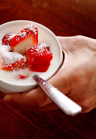 ●パン工房●<苺とパンケーキと・・猫♪>立派な苺を1パック戴きました♪不精者の私、先日、苺は発泡スチロールの箱で保存が良いと聞いていたのにです!!そのままいつものように冷蔵庫に保管・・あっつ、ちょと苺さん、痛まれて・・・。痛んだ部分を包丁で取り除いて、ヨーグルトにたんまり♪無糖で食べる相棒殿無視して、付属の砂糖もたんまりよ(笑)いつもより一杯残って私に回ってきました♪朝相棒殿を送り、もう耐えられないくらいおなかが減って!いそぎ作ったパンケーキ、もうどーんと1枚焼いて、何度もなんども見て(苦笑)待ち遠しい...
