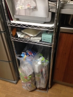 我が家の、電子レンジなどを置いているオープンラックの横。(ルミナスラックの側面に油煙防止のため プラダン を結束バンドで取り付けています)よく見かけるような光景ですが(苦笑)、水筒などが、S字フックで、だらしな〜く吊り下げられています ┐(’〜`;)┌奥の赤い筒状の物体はレジ袋ストッカーで、レジ袋の詰め込み過ぎでゴムが緩くなっており、たまにポトポトとレジ袋が落ちてきますしかも、ここ(ルミナスラックの下)にも、ここ(食洗機ラックの下)にも、一応、それぞれサイズの異なるレジ袋が詰め込まれています (´ヘ`...