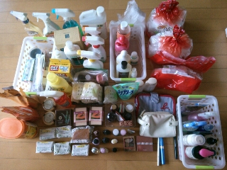 JUGEMテーマ:今日の断捨離 JUGEMテーマ:家事・掃除・片付けがんばろう〜♪ そんなわけで、やっと!一区切りついた!! 7日に引っ張りだしてきた、消耗品や日用品、美容関係消耗品の整理、3日かけて終えました。 これが! 今回我が家からサヨナラするモノたち。 ぎゅーっとコンパクトに置いてみたけど、たたみ一畳分くらいあります。 あっ、このほかに、タオルが山のようにあったこともお忘れなく!! きれいに詰まってるからあんまりピンとこないけど、50枚近くあります。 100サイズの段ボールに...