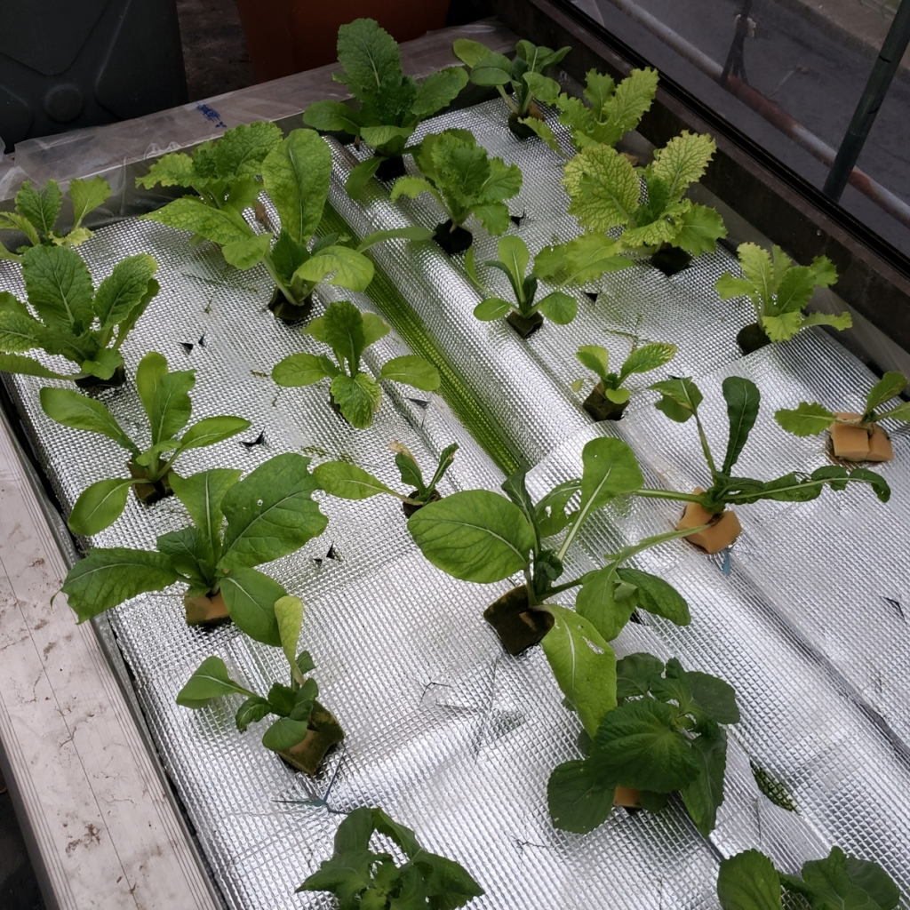 JUGEMテーマ:家庭菜園 ビニールハウス内の水耕栽培用のプールでベビーリーフを大きく育てています。 今後の葉物野菜育成のための実験です。 断熱材に穴をあけて苗をスポンジで固定しています。