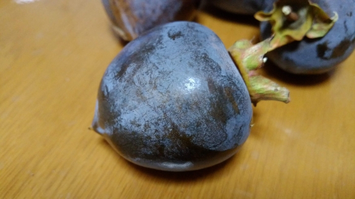 JUGEMテーマ:家庭菜園 今年の我が家の「黒柿」です! 黒柿と言うだけあって、最初から黒いんです! 今年は生らないと思っていたら、6個だけ生っていました〜。