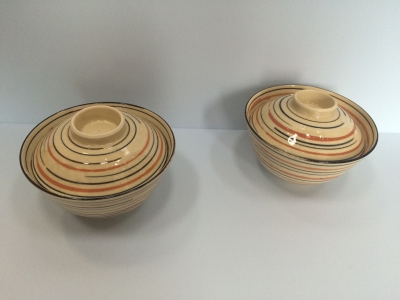 JUGEMテーマ:食器 器を選ぶのは、とても楽しいですよね。 何をのせようとか、 こういうお料理を作ってみたいとか想像するだけでとっても幸せな気分です。 今日は、蓋のついたお茶碗をご紹介いたします。 <梅暁 筋繪茶碗 10客 共箱> 内側の様子↓身と蓋 写真では少し暗くなっていますが、もう少々明るいクリーム色です。 なんといいましょうか、直線的ではない筋がとても温かみを出している作品だと思います。 作者の梅暁さんがどういう人かは不明ではありますが 蓋と身を合わせたときの はま...