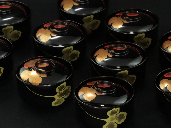 また更新が滞ってしまいました。 申し訳ございません。 長く続けられるように、更新していきますので どうぞよろしくお願い申し上げます。 次の更新は1月31日の金曜日です。 今日は 輪島塗の小吸物椀をご紹介いたします。 <錦光堂 蔦蒔絵小吸物椀 10客 共箱> (直径:9?、高さ:7?) 箱の蓋裏に輪島塗のシールがついています。 日本では蔦のモチ...