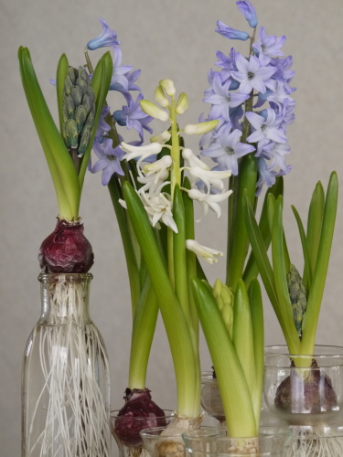 昨日は積もるほど雪が降り、びっくりでした。 もう春だ♪と思ってからのこの気候は堪えるわ〜。 そんな中、水栽培のヒヤシンスが咲き出しました♪ 一斉に咲いたらいいな〜って思っていたけど、なかなか、そううまくはいかないみたい。 ブルージャケット(花色:青紫) ブルーアイズ(花色:薄青) カーネギー(花色:白) 日照不足なのか、ひょろひょろしています。 で… こうなる(;^ω^) もうカットしないとダメですね...