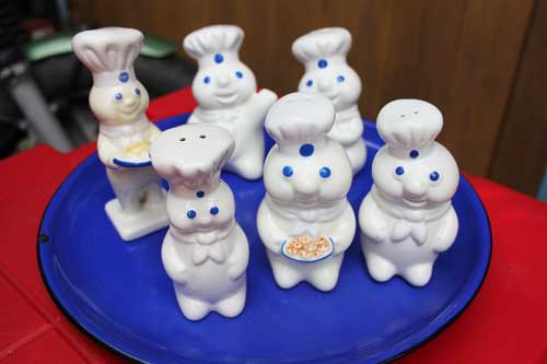 アメリカの有名な製粉会社のマスコット『ドゥボーイ』 ポッピン フレッシュというのが正式なお名前で ファミリーは 本人をふくめて ペットの犬 猫ちゃん入れて 9シリーズ♪ 犬ちゃん ねこちゃん おじさんに至っては ほんとに マボロシ〜 今回オーナーが持って帰ってきた陶器製のソルト&ペッパーたち。 青いホーローのお盆が映えます♪ まんなかの カップは メイド イン USA ペンとえんぴつがかわいい! ...
