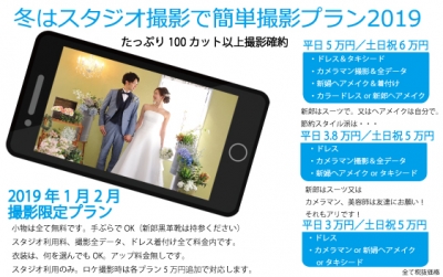 JUGEMテーマ:結婚・新婚(準備中) 東京、寒いですね。 四谷の自宅から、歩いて出勤してるんですが、 外苑は自然豊かだからか、余計に寒く感じます。 冬は、ロケ撮影ちょっと厳しいかな〜と思いまして、 天気に左右されないスタジオ撮影で、お得なプランを 作りました! あれ、ちょっと画像が小さいかな? こちらもどうぞ 2019年1月2月に撮影限定です。 自由に楽しんでいただけるよう...