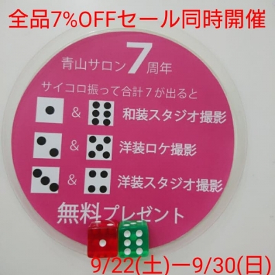 JUGEMテーマ:結婚・新婚(準備中) 青山サロン、おかげさまで7周年を迎えます。 9/30(日)まで、店内全品7%OFF 更に衣装をお申込みの方は、 サイコロチャレンジで 前撮り無料プレゼントのチャンス! ちなみに、本日、和装前撮り無料の大当たりが出ました!! チャンス大有りです!是非、チャレンジしてください。 さて、今日のお題ですが、 通常、平日の予約営業日はタキシード全品30%OFFの 特割DAYを開...