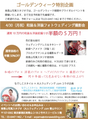 JUGEMテーマ:結婚・新婚(準備中) 3月に入ったばっかりですが、来月末からゴールデンウイークですよね。 今年のゴールデンウイークですが、 連日イベントを開催する予定です。 まずは、4/30(月祝)のイベント紹介。 ご近所の和装専門サロンなでしこスタイルさんとコラボして、 超絶お得な前撮り撮影会を開催いたします! 関東近郊以外の方も、是非ご参加ください。 東京青山で、前撮り撮影で...