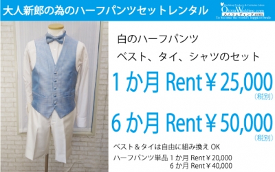 JUGEMテーマ:結婚・新婚(準備中) 大人ウェディング.com青山サロンでは、平日の月木に 来店された方に限り、タキシード全品30%OFFで ご利用いただいております。 タキシードは、全品一律価格です。 何を選んでもOK お値段は、いつから借りるかで変わります。 リゾートウェディングで人気のハーフパンツセット。 定価でも十分安いですが、 平日の月木に来店すると、ここから更に30%OFFになります。  ...