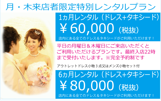 JUGEMテーマ:結婚・新婚(準備中) 毎週平日の月曜日と木曜日は特割DAYを開催しています。 月木に来店した人だけ使える超絶お得な レンタルパックプラン↓ 店内のすべての衣装がプラン内になります。 どのドレスとタキシードを選んでも、 1か月レンタル(ドレス+タキシード)6万円(税抜) 6か月レンタル(ドレス+タキシード)8万円(税抜) 平日の月曜日、木曜日は完全予約制です。 午前中〜最終入店22時まで受け付けています。 お仕...