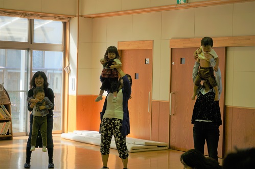 JUGEMテーマ:子育て 今日のカンガルークラブは 『リトミック 音楽の先生と遊ぼう』 素敵なピアノの音色がホールに響いていました。 ピアノに合わせて親子で体をほぐします。 高ーい高ーい こんなに高いよ!(^^)! 次にとってもきれいなでふわふわした布で 遊びます。 ゆらゆらしたり、エイっと投げてキャッチしたり… ふわふわした布を持って走ると… 気持ちいいね~ どんぐり...