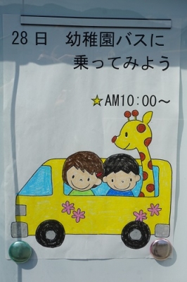 JUGEMテーマ:子育て 今週の未就園児の親子登園「カンガルークラブ」は 【幼稚園バスに乗ってみよう】です。 園バスに乗って若穂内の公園まで行きたいと 思います。 持ち物:上履き・帽子・水筒(水またはお茶入り) ☆是非、お出掛け下さい