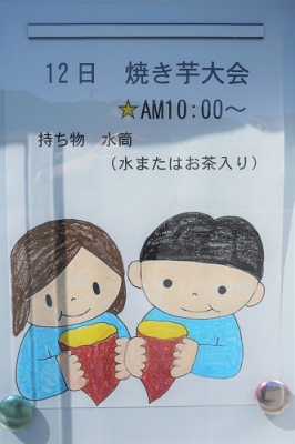 JUGEMテーマ:子育て 明日の未就園児の親子登園「カンガルークラブ」は 【焼き芋大会】です。 おひさま畑で育て、収穫したさつま芋を頂きます!! 持ち物:上履き・帽子・水筒(水またはお茶入り) 是非、お出掛け下さい