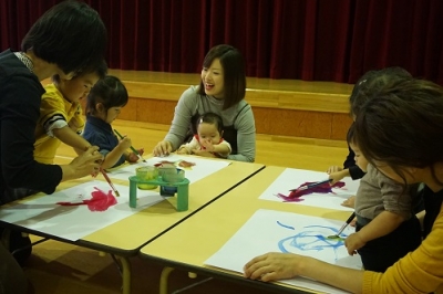 JUGEMテーマ:子育て 今日の未就園児の親子登園「カンガルークラブ」は 【焼き芋大会】の予定でしたが雨天の為、予定を変更して 【絵の具を使おう!】を行いました。 絵筆を使って、赤や黄色・水色・ピンクと 好きな絵の具の色を付け大きな白い紙に絵を描きました。 手に色を付けて、手形をとるお友だちもいました 「いろ、まじぇてるの。(色、混ぜてるの。)」 大きな白い紙が、沢山の色模様にな...