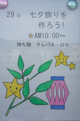 JUGEMテーマ:子育て 明日の未就園児の親子登園 「カンガルークラブ」は【七夕飾りを作ろう!】です。 持ち物:上履き・水筒(水またはお茶入り) クレパス・のり ☆是非、お出掛け下さい。