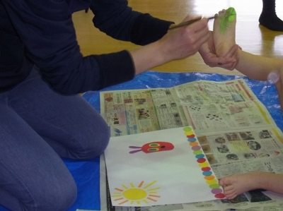 JUGEMテーマ:子育て 今日の「カンガルークラブ」の様子をお伝えします 今日は4.5月のお友達の誕生会をしました。 今年度のカンガルークラブでは、 誕生会ごとに「手形・足形アート」を行います。 第1弾は「はらぺこあおむし」です!! まず、足の裏に絵の具を塗って さぁ、おしてみよう! 上手におせたかな? 反対向きからも、おしてみよう 緑色と黄緑色で順番に... 出来ました!...