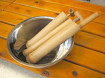 JUGEMテーマ:手造りおもちゃ せっかくの夏休みなので、この時期にぴったりのお題、竹水鉄砲の造り方を取り上げまっせ(笑)。 下がその完成見本。 ●準備するもの