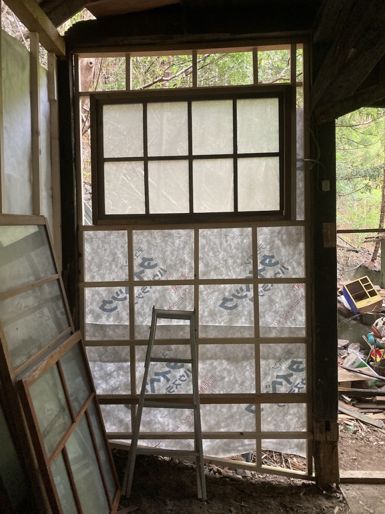 JUGEMテーマ:ソトアソビ 元々は無かった腰壁を作りガラス戸を設置した昭和のリノベーション。 左側は増築した洗面所。 ガラス戸を全て撤去。 増床した洗面所も撤去して建築時の姿に戻します。 広くてサッパリ、キレイになりました。 透湿防水シートを貼りました。 ちょっと狭いイメージですがこれでも1.8mあります。 ここに顔を作りメインにします。 正面入口...