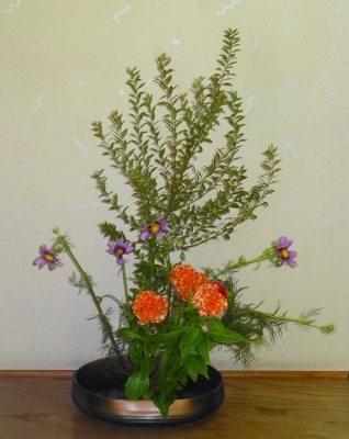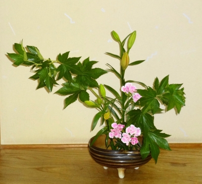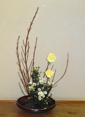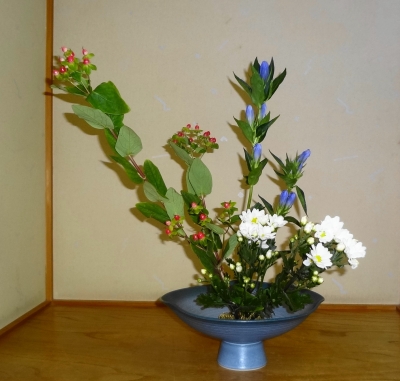 いけばなのおけいこを始めて、 まだ間もない子達。 基本のおけいこです。 まっすぐなヒぺリカムの枝が3本。 長さと角度を変えて、 剣山に挿しました。 斜めに挿すということは、 意外と難しいものです。 もっと斜めに倒しています。 でも、きちんと留まっていますよ。 リンドウ2本も、変化を付け、 小菊で、足元をまとめました。 ヒぺリカムを右に倒して、 その下に水面を見せています。 夏の涼しげなお花になりましたね。 ほぼまっすぐな花材。 それでも、いろんな表現ができます。 ...