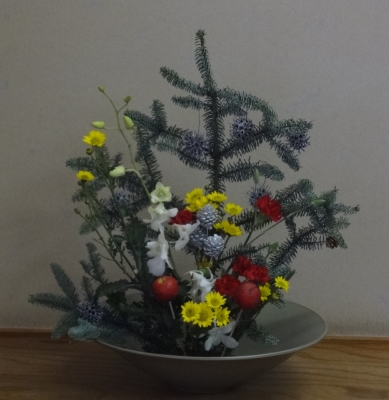 街にはクリスマスソングがあふれています。 お店の飾りつけも、ツリーやプレゼントボックス。 玄関のドアにリースを飾っているおうちも よく見かけますね。 クリスマスは、子ども達にとって特別の日。 待ち遠しい気持ちを込めて、おけいこしました。 もみの枝の前に お花や銀色の松ぼっくりを挿しました。 かわいい姫リンゴも! 金のツガの実と銀のフウの実もプラス。 にぎやかになったかな? もみの枝は、剣山に挿しにくかったね。 リンゴは、竹串に挿しています。 スプレ−カーネーション...