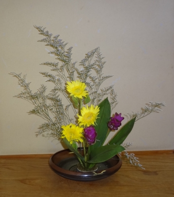 子ども達の学校は夏休み。 でも、いけばなは真夏もおけいこします。 ほんとうは、夏のお花はいたみやすい。 長持ちしないです。 それでもおけいこするのは、 夏のお花に出会いたいから。 ヒマワリが来ました。 あざやかな黄色が印象的。 細かいお花がキラキラしているような ブルーファンタジア。 クルクマシャロームもそえて、まとめました。 さわやかなお花ができたかな? ひとりひとりの工夫のあとを見てください。 ヒマワリ3本が、お話しているように。 花首の角度を変えて、表情を出し...