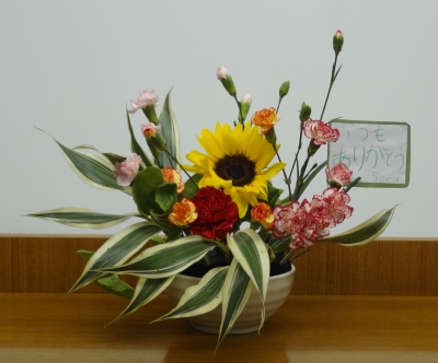 明日は母の日 お母さんへの感謝の気持ちを込めて、 メッセージカードをそえたアレンジメント。 子ども達には、家から器を持ってきてもらいました。 お花は同じもの。 でも、ほら、こんなに個性あふれる作品ができました。 いつもと勝手がちがうかも。 吸水スポンジの使い方も覚えようね。 大きなヒマワリから、元気がもらえます。 赤いカーネーションからは、ありがとうが伝わります。 3色のスプレーカーネーションを、 思い思いに挿していきました。 ドラセナの葉ですきまをうめて・・・ ...